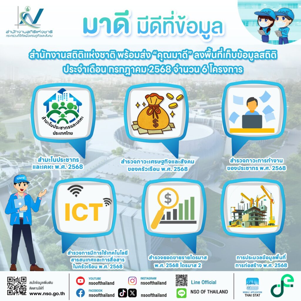 - สำนักงานสถิติแห่งชาติ พร้อมส่ง “คุณมาดี” ลงพื้นที่เก็บข้อมูลสถิติ ประจำเดือนกรกฎาคม 2568 จำนวน 6 โครงการ