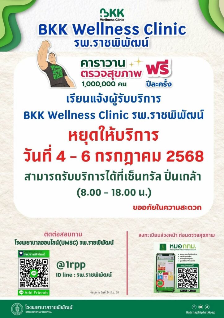 รพ.ราชพิพัฒน์ แจ้งผู้รับบริการ BKK wellness clinic รพ.ราชพิพัฒน์ หยุดให้บริการ บัดนี้ – 6 ก.ค. 68