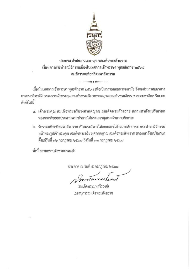 เนื่องในเทศกาลเข้าพรรษา พุทธศักราช 2568 เพื่อเป็นการถนอมพระอนามัย จึงขอประกาศแนวทางการกระทำสามีจิกรรมถวายเจ้าพระคุณ สมเด็จพระอริยวงศาคตญาณ สมเด็จพระสังฆราช สกลมหาสังฆปริณายก ดังต่อไปนี้