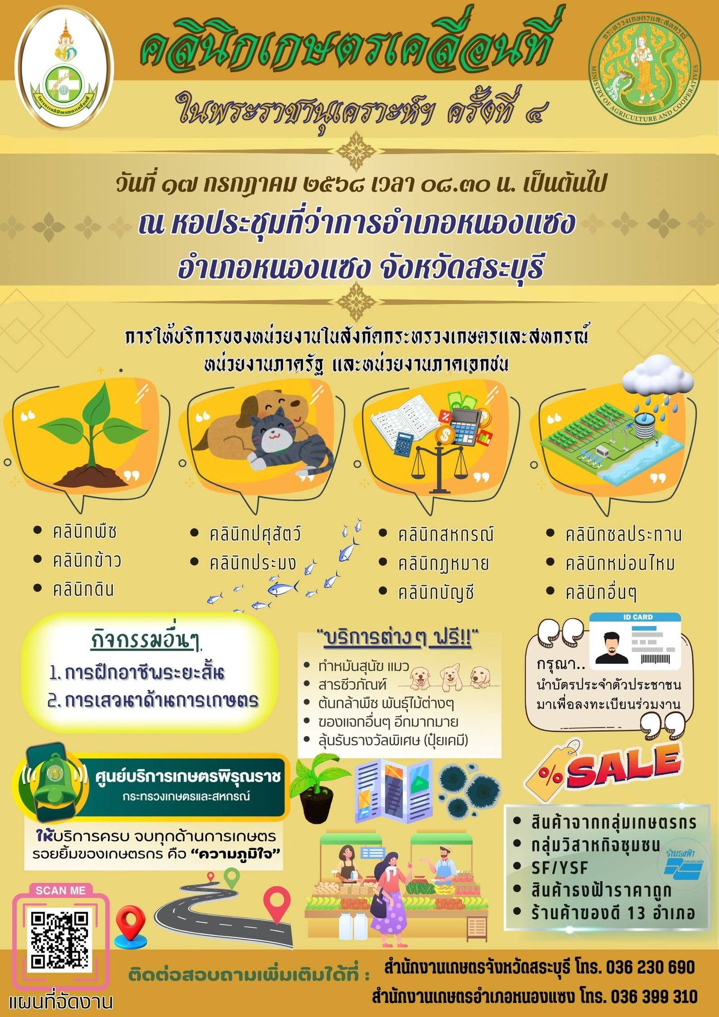 จังหวัดสระบุรี ขอเชิญร่วมงานโครงการคลินิกเกษตรเคลื่อนที่ ในพระราชานุเคราะห์ สมเด็จพระบรมโอรสาธิราช สยามมกุฎราชกุมาร ครั้งที่ 4 ในวันที่ 17 กรกฎาคม 2568 ตั้งแต่เวลา 08.30 น. ณ หอประชุมที่ว่าการอำเภอหนองแซง อำเภอหนองแซง จังหวัดสระบุรี