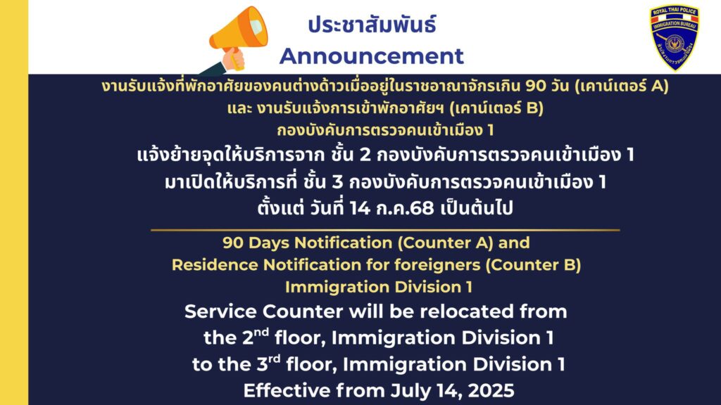 กองบังคับการตรวจคนเข้าเมือง 1 ประกาศงานรับแจ้งที่พักอาศัยของคนต่างด้าวเมื่ออยู่ในราชอาณาจักรเกิน 90 วัน (เคาน์เตอร์ A) และ งานรับแจ้งการเข้าพักอาศัยฯ (เคาน์เตอร์ B) ย้ายจุดให้บริการจาก ชั้น 2 กองบังคับการตรวจคนเข้าเมือง 1 มาเปิดให้บริการที่ ชั้น 3 กองบังคับการตรวจคนเข้าเมือง 1เริ่มตั้งแต่ วันที่ 14 กรกฎาคม 2568