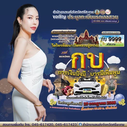 สำนักงานขนส่งจังหวัดศรีสะเกษ ขอเชิญร่วมงานประมูลทะเบียนรถเลขสวย หมวดอักษร กบ ในวันที่ 19 ก.ค. 68