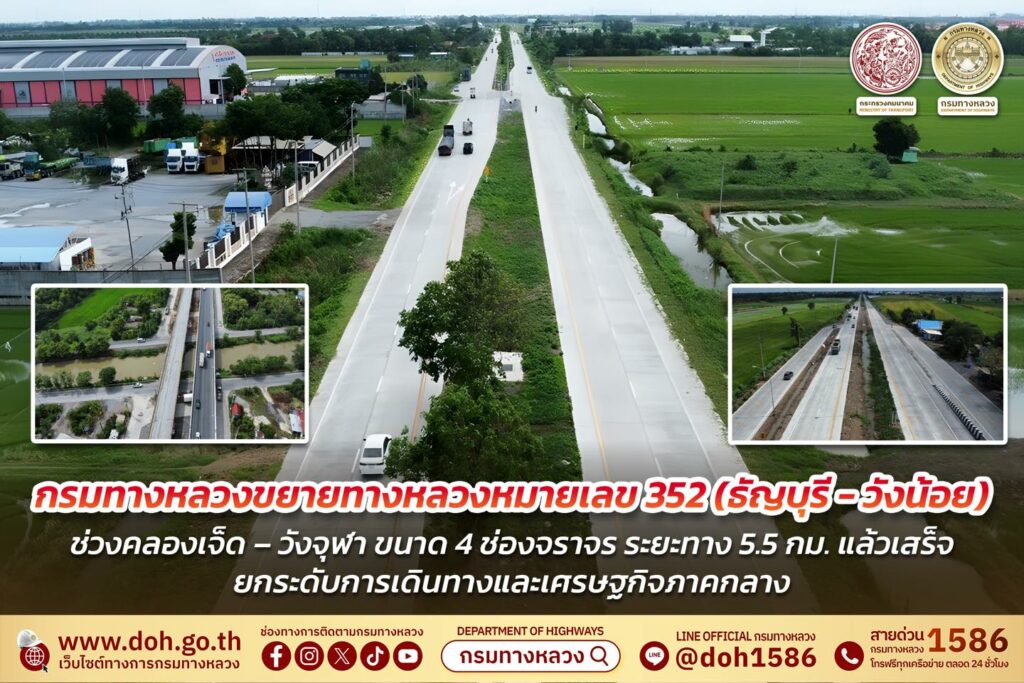 กรมทางหลวง ขยาย 4 ช่องจราจร ทางหลวงหมายเลข 352 ช่วงคลองเจ็ด – วังจุฬา จ.ปทุมธานีแล้วเสร็จ