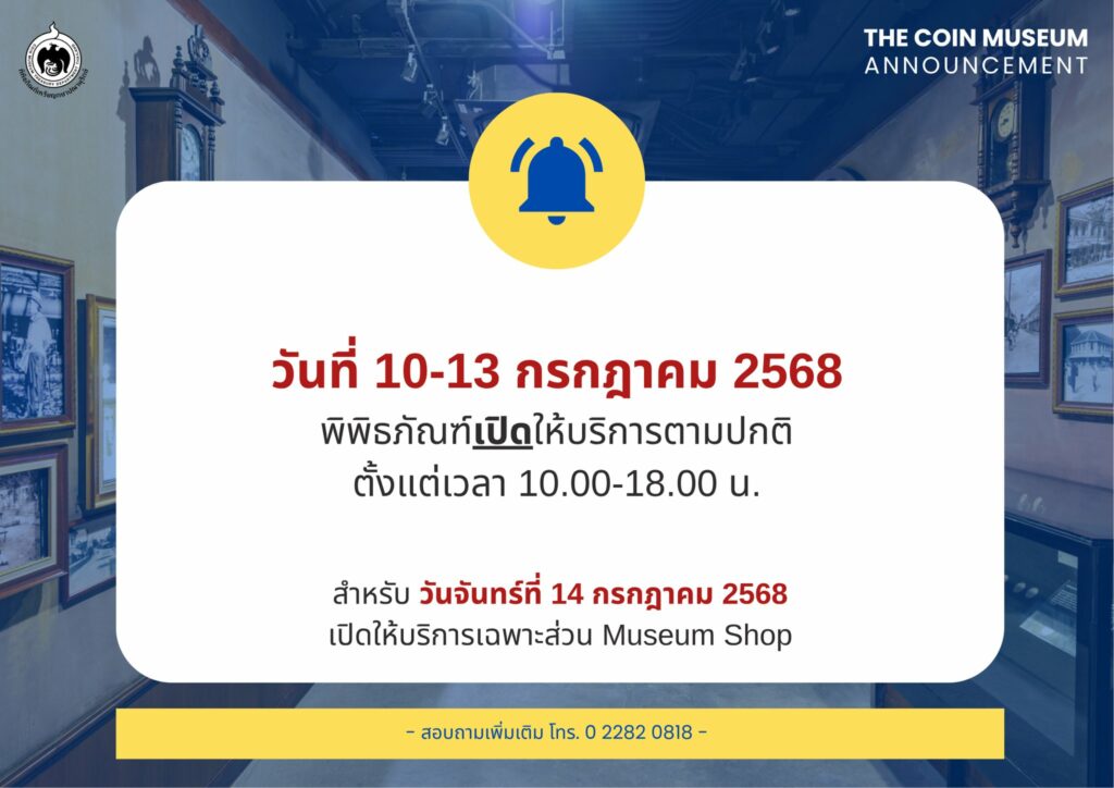 พิพิธภัณฑ์เหรียญกษาปณานุรักษ์ เปิดให้เข้าชมตามปกติ วันที่ 10 – 13 กรกฎาคม 2568