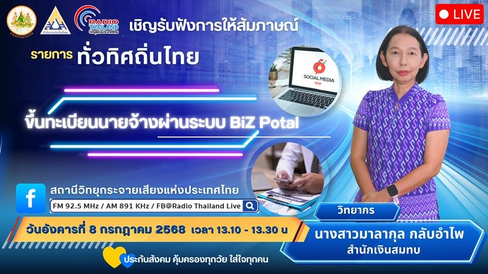 เชิญรับฟังการให้สัมภาษณ์ รายการทั่วทิศถิ่นไทย ประเด็น ขึ้นทะเบียนนายจ้างผ่านระบบ BiZ Potal ออกอากาศทางสถานีวิทยุกระจายเสียงแห่งประเทศไทย คลื่นวิทยุ FM 92.5 MHz /AM 891 KHz /FB@Radio Thailand Live” วันอังคารที่ 8 กรกฎาคม 2568 เวลา 13.10 – 13.30 น.
