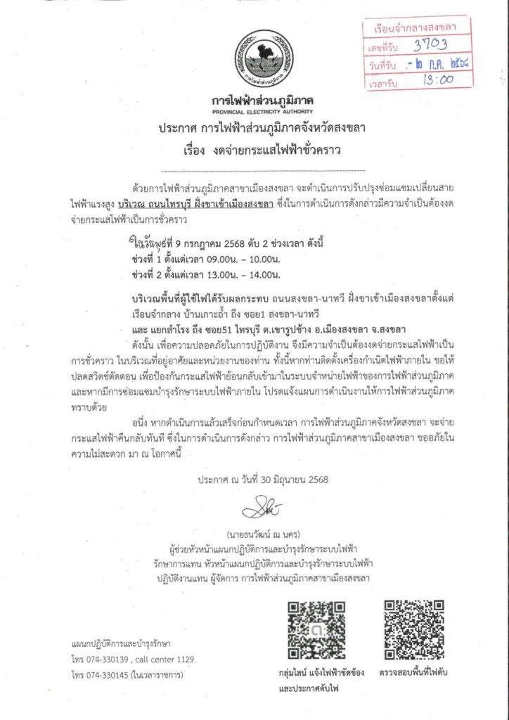 เนื่องจาก ทางเรือนจำฯ ได้รับแจ้งจาก การไฟฟ้าส่วนภูมิภาคสาขาเมืองสงขลา จะดำเนินการปรับปรุงซ่อมแซมเปลี่ยนสายไฟฟ้าแรงสูง บริเวณถนนไทรบุรี ฝั่งขาเข้าเมืองสงขลา ซึ่งในการดำเนินการดังกล่าว มีความจำเป็นต้องงดจ่ายกระแสไฟฟ้าเป็นการชั่วคราว ตั้งแต่เรือนจำกลางสงขลา ถึง ซอย 1 ถนนสงขลา-นาทวี ในวันพุธ ที่ 9 กรกฎาคม 2568 ดับ 2 ช่วงเวลา