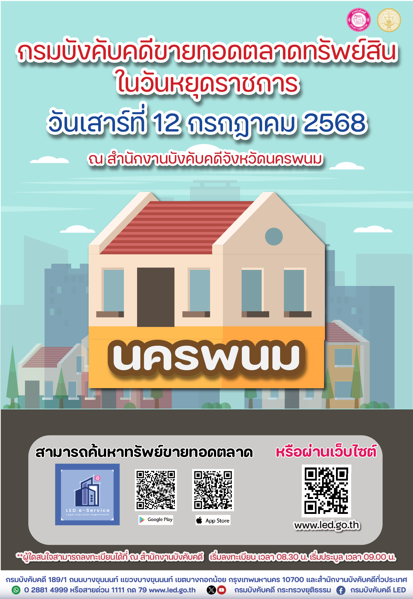 กรมบังคับคดี เชิญร่วมงานขายทอดตลาดทรัพย์สินในวันหยุดราชการ ในวันเสาร์ที่ 12 กรกฎาคม 2568 ณ สำนักงานบังคับคดีจังหวัดนครพนม เริ่มลงทะเบียน เวลา 8.30 น. เริ่มประมูล เวลา 09.00 น.