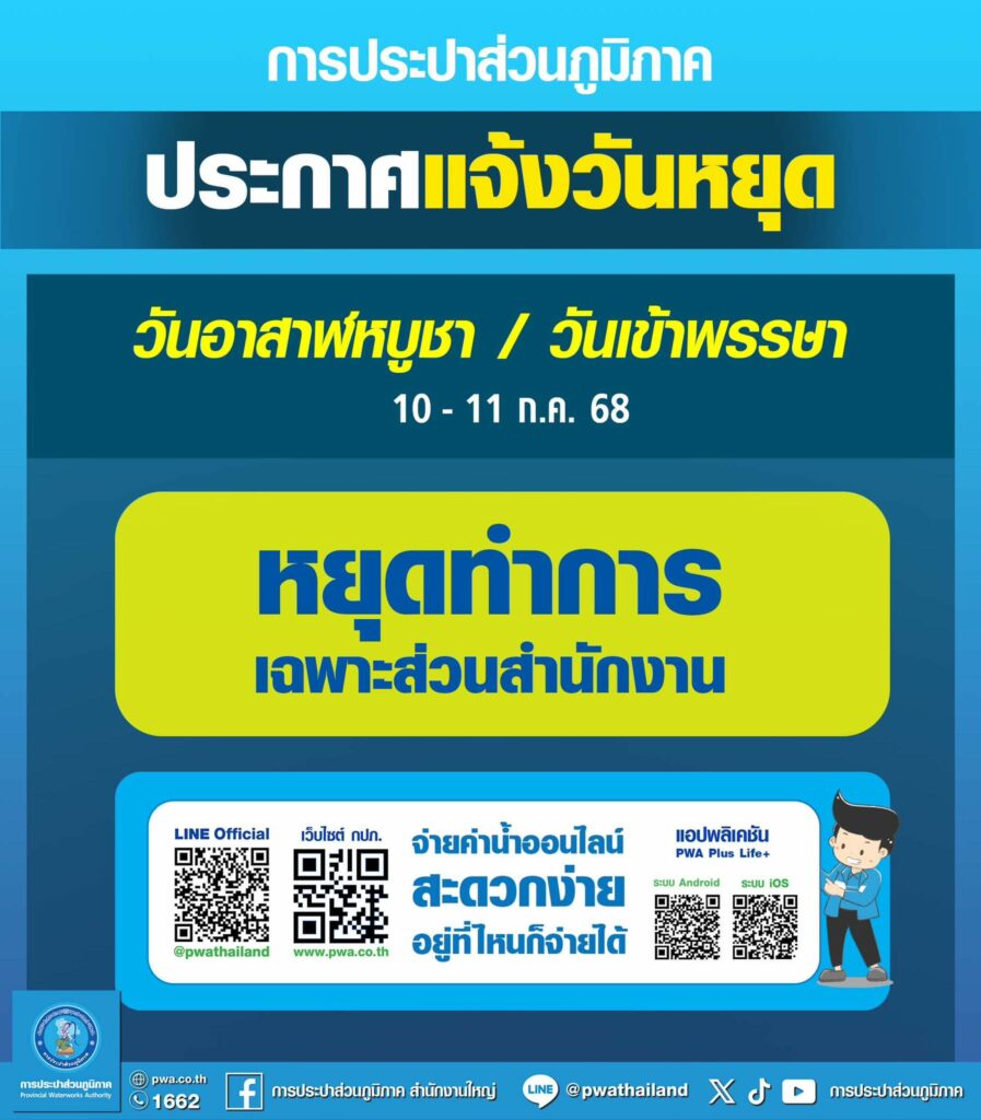 การประปาส่วนภูมิภาค แจ้งปิดทำการเฉพาะส่วนสำนักงาน วันที่ 10-11 กรกฎาคม 2568 เนื่องในวันอาสาฬหบูชาและวันเข้าพรรษา