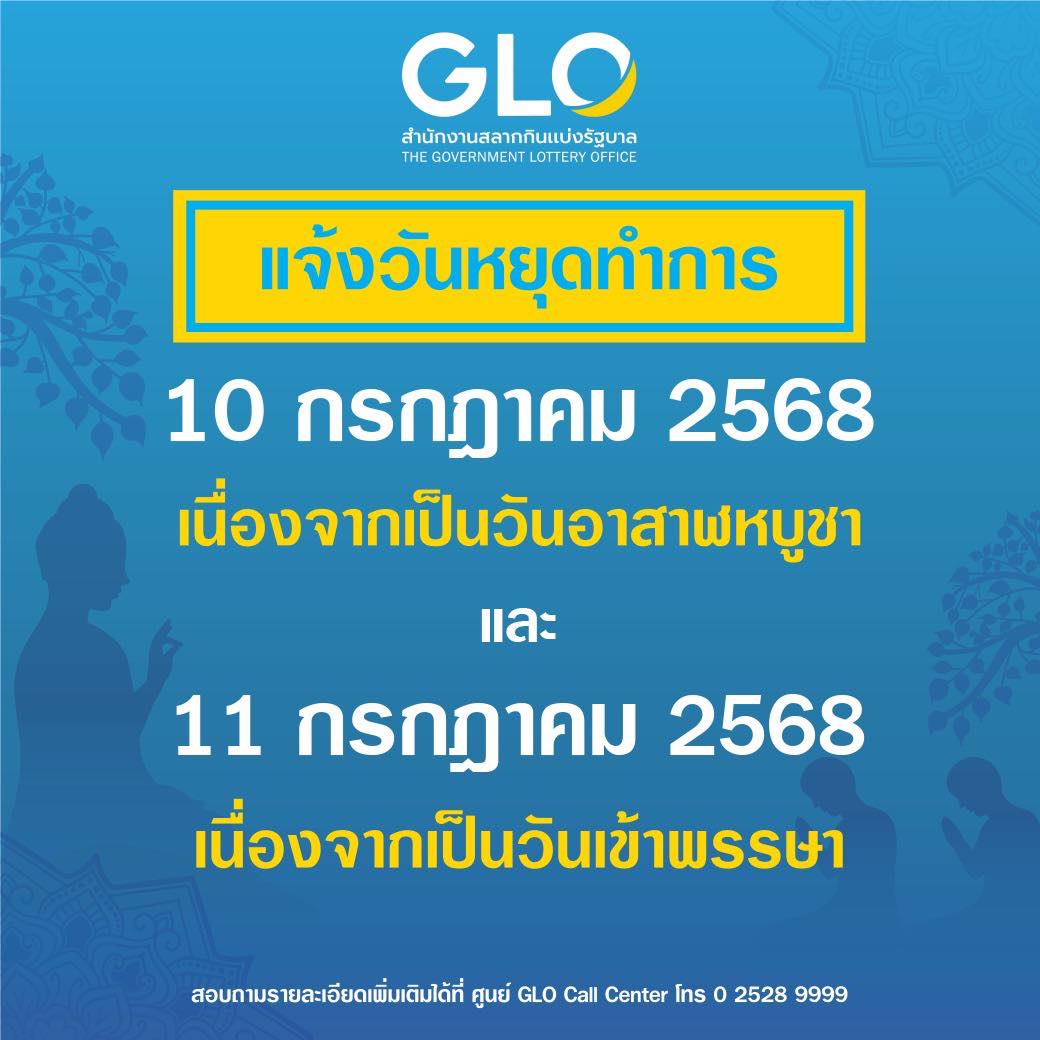 สำนักงานสลากกินแบ่งรัฐบาล แจ้งวันหยุดทำการเนื่องจากเป็นวันอาสาฬหบูชา วันที่ 10 – 11 กรกฎาคม 2568 เนื่องจากเป็นวันเข้าพรรษา