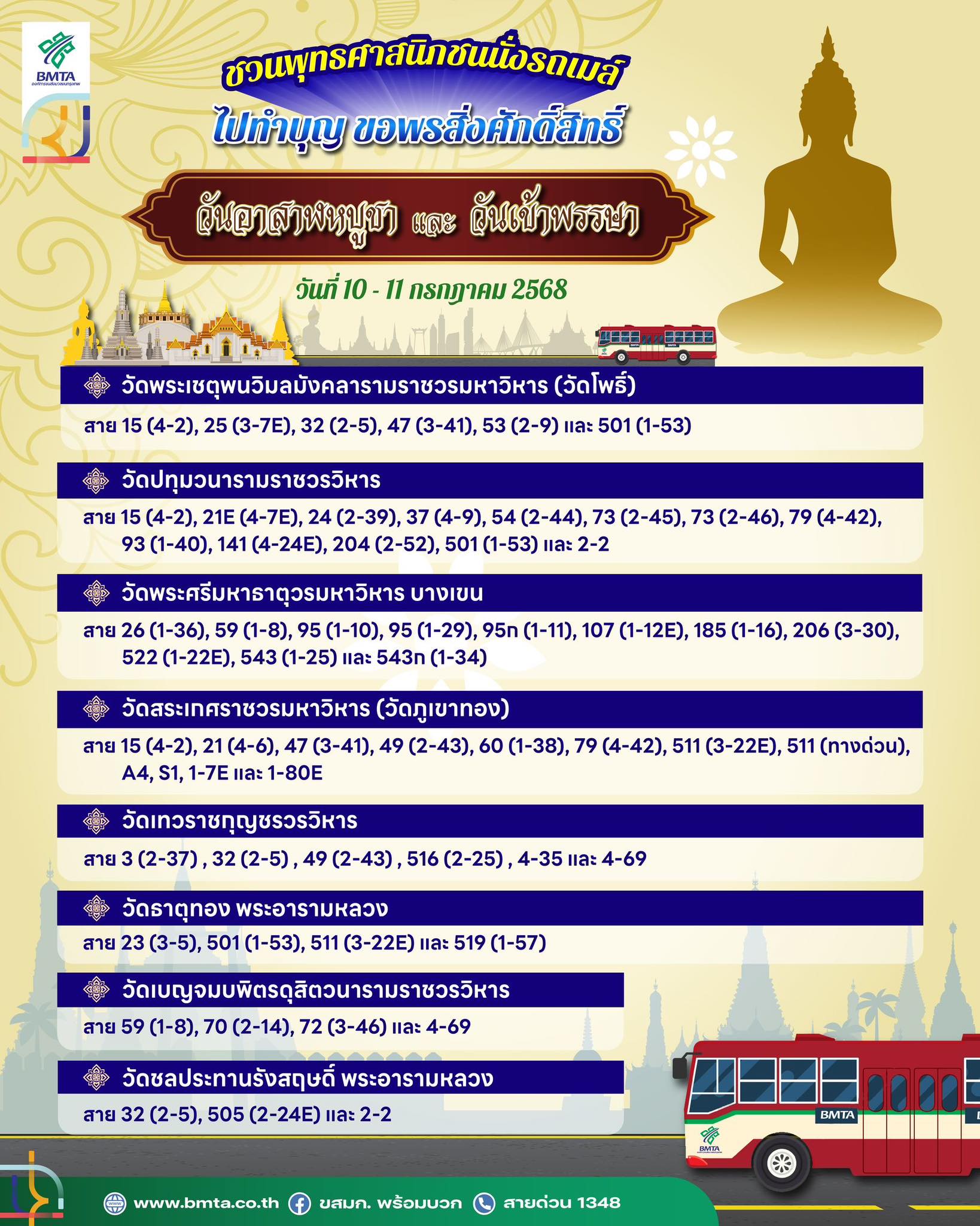 องค์การขนส่งมวลชนกรุงเทพ แนะนำเส้นทางรถโดยสารประจำทางที่ผ่านวัดสำคัญทั่วกรุงเทพ  เนื่องในวันอาสาฬหบูชา และวันเข้าพรรษา วันที่ 10 – 11 กรกฎาคม 2568 สอบถามเส้นทางเพิ่มเติมได้ที่ BMTA Contact Center โทร. 1348 ,เฟซบุ๊กแฟนเพจ “ขสมก. พร้อมบวก” ,เว็บไซต์ www.bmta.co.th