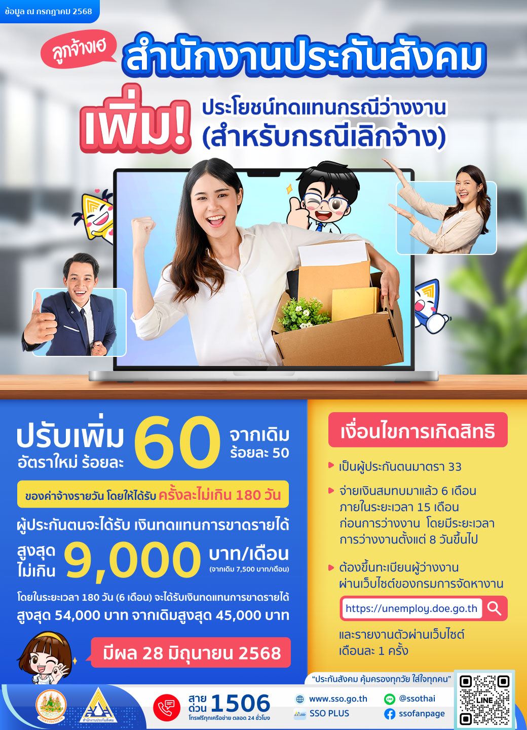 สำนักงานประกันสังคม เพิ่มประโยชน์ทดแทนกรณีว่างงาน สำหรับ ‘กรณีเลิกจ้าง’ จากเดิม ร้อยละ 50 ปรับเพิ่มอัตราใหม่ ร้อยละ 60 ของค่าจ้างรายวัน โดยให้ได้รับครั้งละไม่เกิน 180 วัน ผู้ประกันตนจะได้รับเงินทดแทนการขาดรายได้ สูงสุดไม่เกิน 9,000 บาท/เดือน (จากเดิม 7,500 บาท/เดือน) โดยในระยะเวลา 180 วัน (6 เดือน) จะได้รับเงินทดแทนการขาดรายได้สูงสุด 54,000 บาท (จากเดิมสูงสุด 45,000 บาท) มีผลตั้งแต่บัดนี้เป็นต้นไป