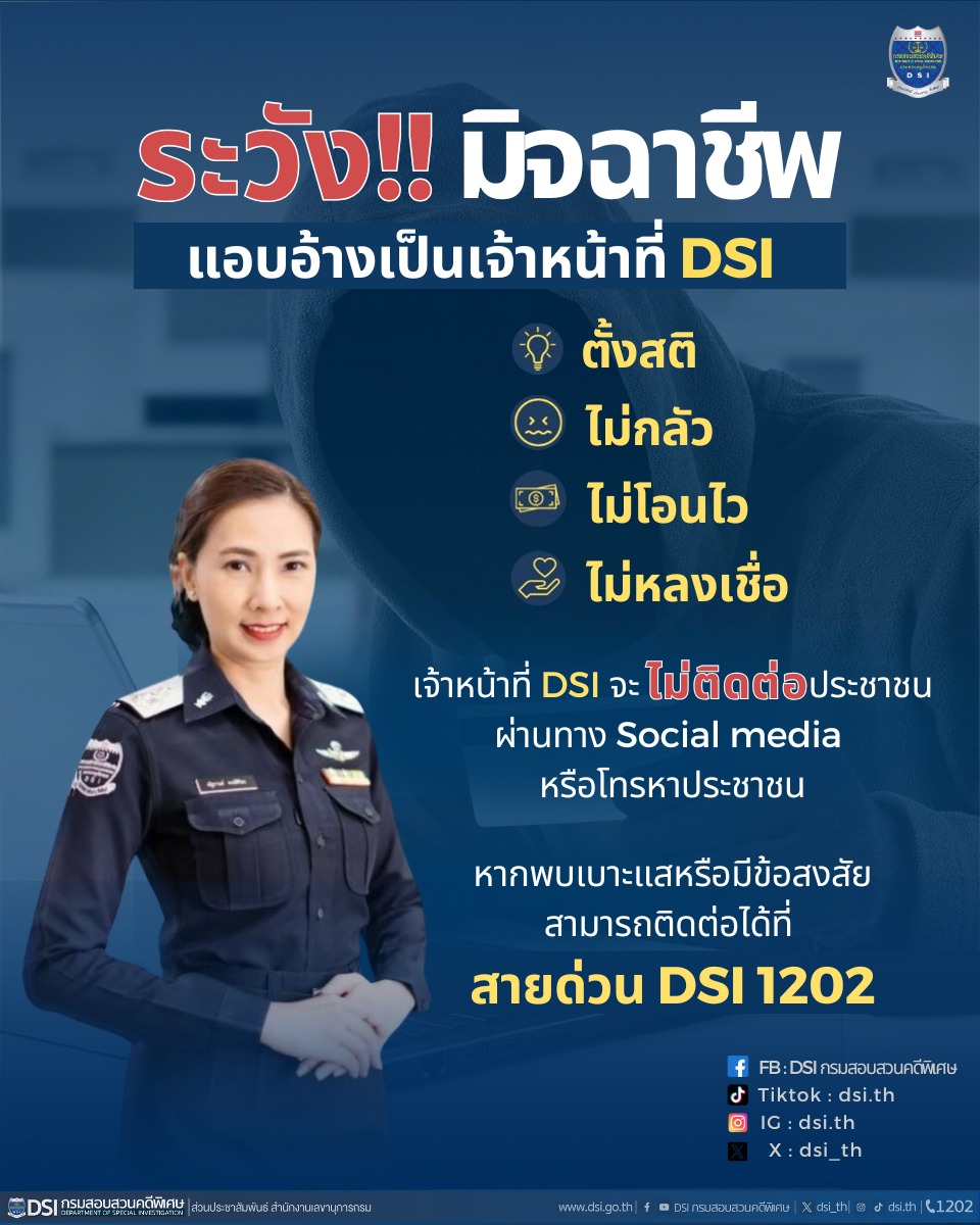 กรมสอบสวนคดีพิเศษ เตือนระวังมิจฉาชีพแอบอ้างเป็นเจ้าหน้าที่ DSI โทรมาหลอกให้โอนเงิน อ้างว่าคุณมีคดี หรือทำผิดกฎหมาย ทั้งนี้ เจ้าหน้าที่ DSI ไม่มีนโยบายติดต่อประชาชนผ่านโซเชียล ใครอ้างแบบนี้เท่ากับมิจฉาชีพ แนะนำให้ตั้งสติ ไม่กลัว ไม่โอน และไม่เชื่อ