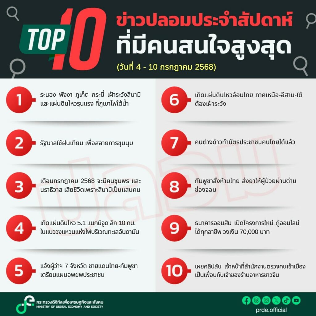 ดีอี เตือน ข่าวปลอม “เตือนจังหวัดฝั่งอันดามัน เฝ้าระวังสึนามิ-แผ่นดินไหวรุนแรง จากภูเขาไฟใต้น้ำ”