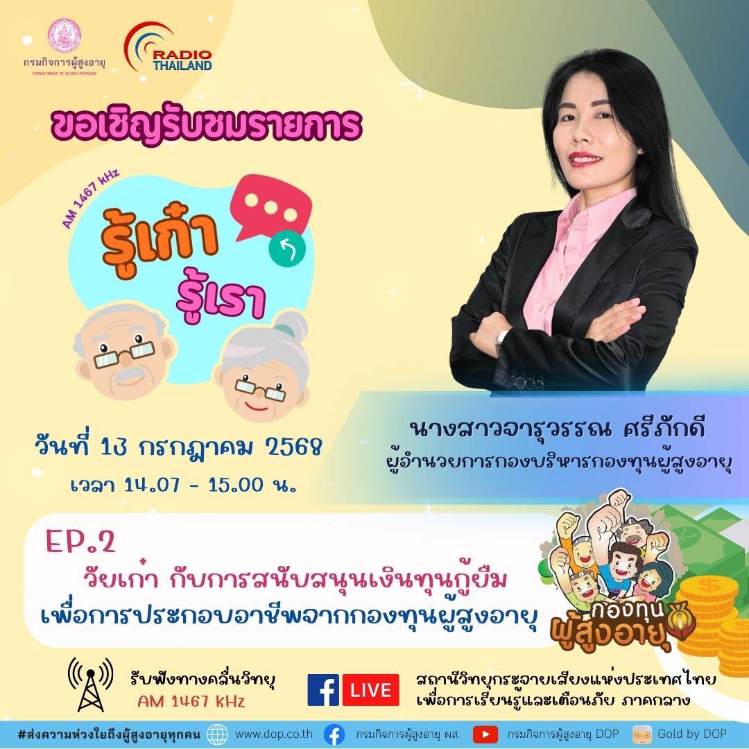 กรมกิจการผู้สูงอายุ ขอเชิญรับชมรายการ รู้เก๋า รู้เรา ประเด็น : วัยเก๋า กับการสนับสนุนเงินทุนกู้ยืม เพื่อการประกอบอาชีพจากกองทุนผู้สูงอายุ วันที่ 13 กรกฎาคม 2568 เวลา 14.07 – 15.00 น. ออกอากาศทาง : สถานีวิทยุกระจายเสียงแห่งประเทศไทยเพื่อการเรียนรู้และเตือนภัย ภาคกลาง AM 1467kHz เเละเฟสบุ๊คสถานีวิทยุกระจายเสียงแห่งประเทศไทยเพื่อการเรียนรู้และเตือนภัย ภาคกลาง ให้สัมภาษณ์ โดย นางสาวจารุวรรณ ศรีภักดี ผู้อำนวยการกองบริหารกองทุนผู้สูงอายุ