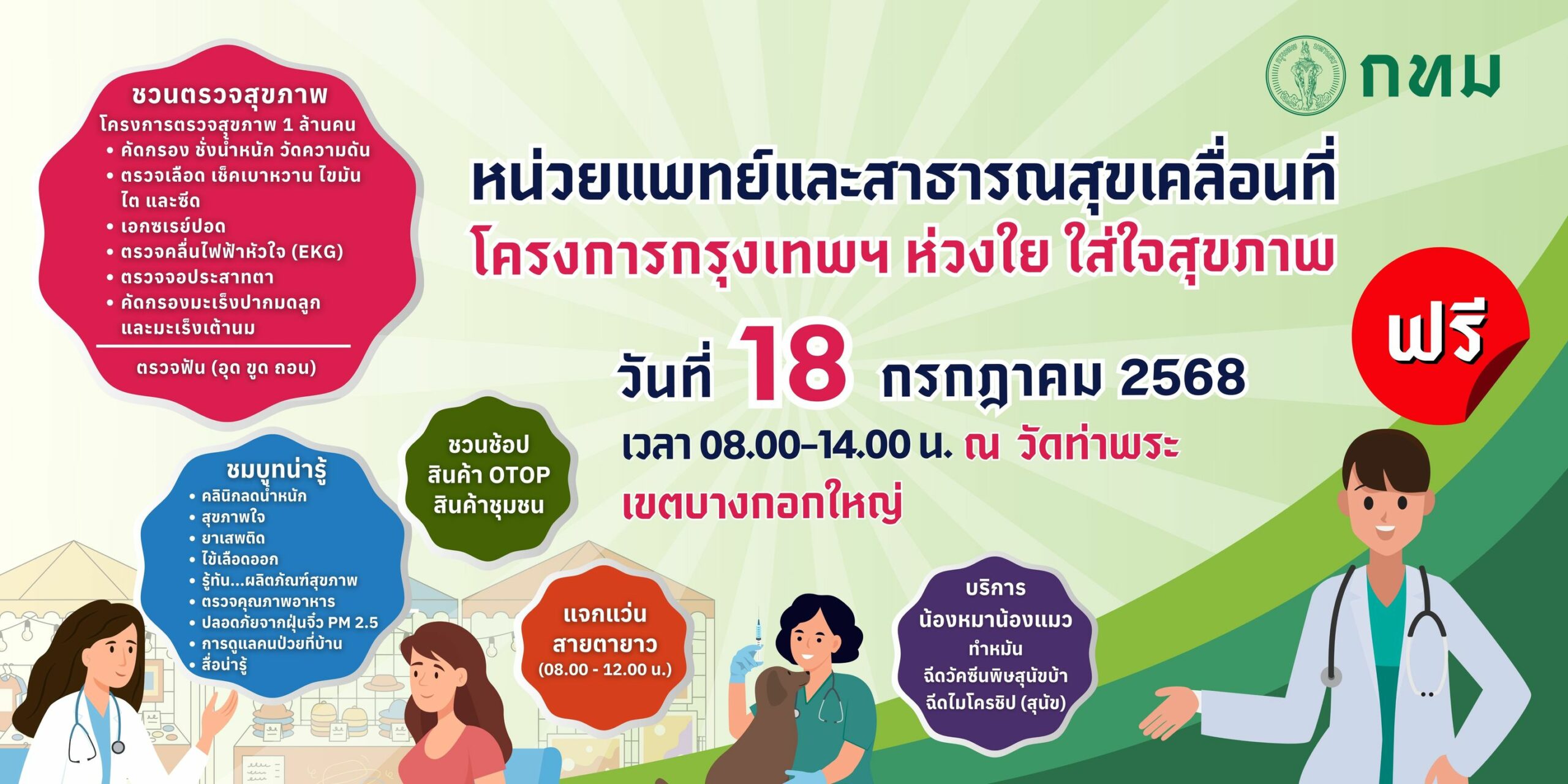 กรุงเทพมหานคร เชิญร่วมกิจกรรมบริการสุขภาพเคลื่อนที่ “สุขภาพดี ใกล้บ้าน ใกล้หมอ” ตรวจสุขภาพ ฟรี ในวันที่ 18 กรกฎาคม 2568 ตั้งแต่เวลา 08.00 – 14.00 น. ณ วัดท่าพระ เขตบางกอกใหญ่