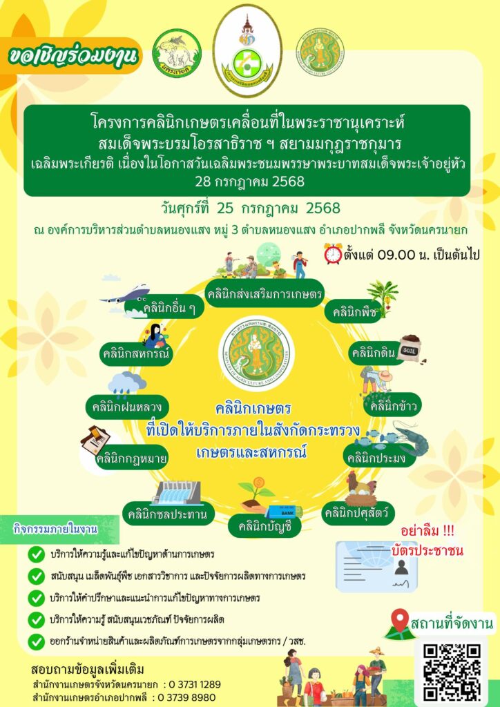 เกษตรนครนายก ขอเชิญร่วมงาน“คลินิกเกษตรเคลื่อนที่ ฯ” โครงการคลินิกเกษตรเคลื่อนที่ในพระราชานุเคราะห์สมเด็จพระบรมโอรสาธิราช ฯ สยามมกุฎราชกุมารเฉลิมพระเกียรติ เนื่องในโอกาสวันเฉลิมพระชนมพรรษา พระบาทสมเด็จพระเจ้าอยู่หัว28 กรกฎาคม 2568 วันศุกร์ที่ 25 กรกฎาคม 2568 ตั้งแต่เวลา 09.00 น. เป็นต้นไป ณ องค์การบริหารส่วนตำบลหนองแสง ตำบลหนองแสง อำเภอปากพลี จังหวัดนครนายก