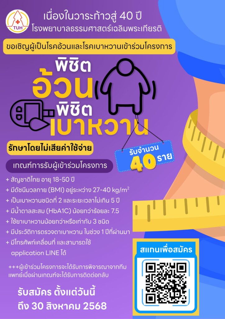 เนื่องในโอกาสก้าวสู่ปีที่ 40 ของโรงพยาบาลธรรมศาสตร์เฉลิมพระเกียรติ ขอเชิญผู้ที่เป็น โรคอ้วน และ เบาหวานชนิดที่ 2 เข้าร่วมโครงการดูแลสุขภาพแบบใกล้ชิดกับทีมแพทย์เฉพาะทาง