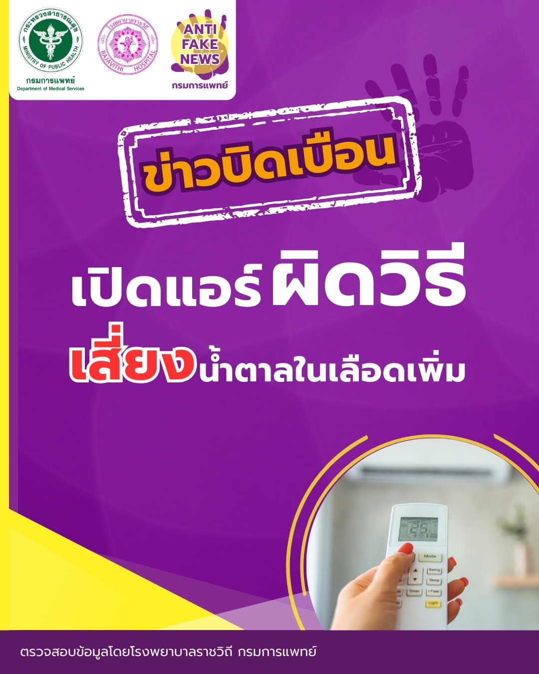 กรมการแพทย์ ชี้แจงข้อเท็จจริงเกี่ยวกับการเปิดแอร์อุณหภูมิต่ำเกินไป อยู่ในห้องแอร์ตลอด โดยไม่เสียเหงื่อเลย เสี่ยงน้ำตาลในเลือดเพิ่ม และอากาศถ่ายเทไม่สะดวก เสี่ยงติดเชื้อ โรงพยาบาลราชวิถี ชี้แจงว่า ข้อมูลนี้จริงบางส่วน จริงในแง่ที่ว่า เมื่อหนาวจัด ร่างกายอาจหลั่ง adrenaline เพิ่มขึ้น ร่างกายอาจหลั่ง adrenaline เพิ่มขึ้น ซึ่งอาจกระตุ้นการปล่อยกลูโคสจากตับ แต่ยังไม่ถึงระดับกระตุ้นซิมพาเทติก และการอยู่ในห้องแอร์ตลอด ไม่เสียเหงื่อ การเผาผลาญพลังงานน้ำตาลในเลือดอาจไม่ลดลงแต่ไม่ใช่เพราะแอร์โดยตรง