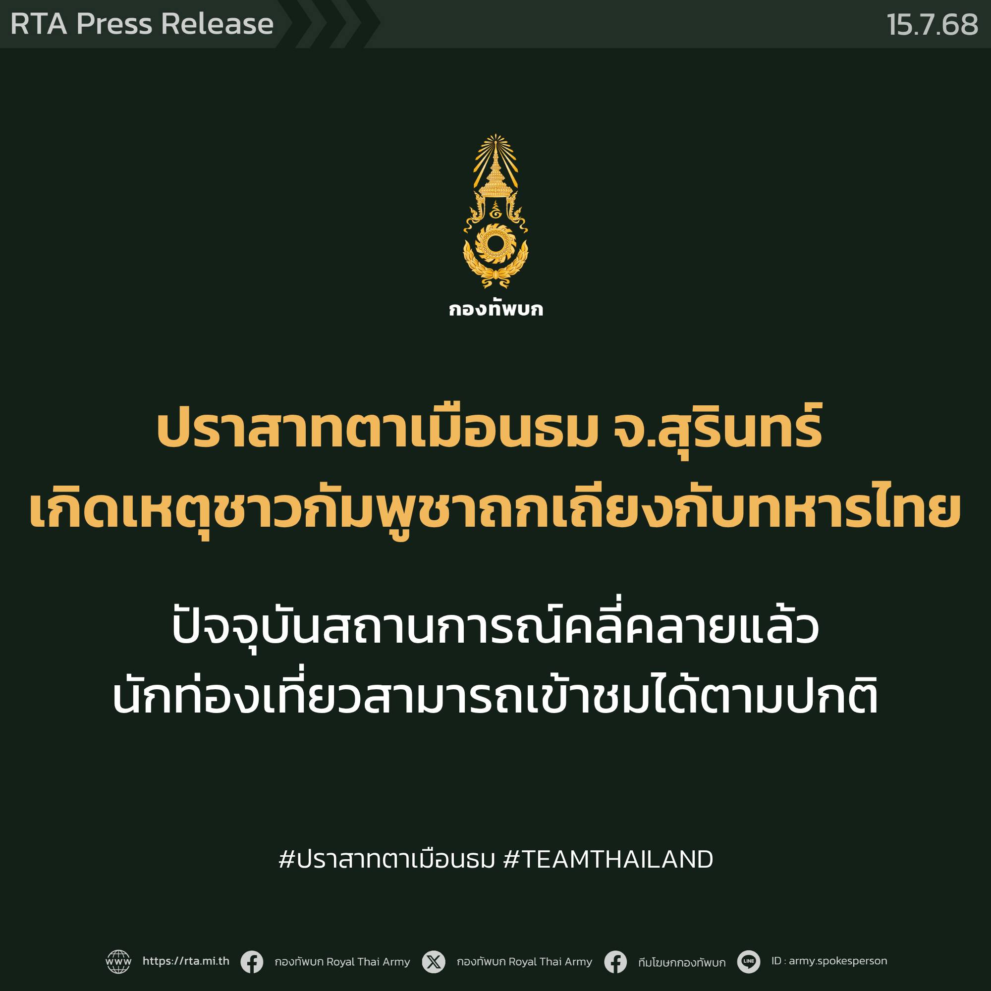 กองทัพภาคที่ 2 ชี้แจงเหตุการณ์บริเวณปราสาทตาเมือนธม จ.สุรินทร์ อยู่ระหว่างตรวจสอบข้อเท็จจริงเพิ่มเติม และจะรายงานความคืบหน้าให้ทราบต่อไป