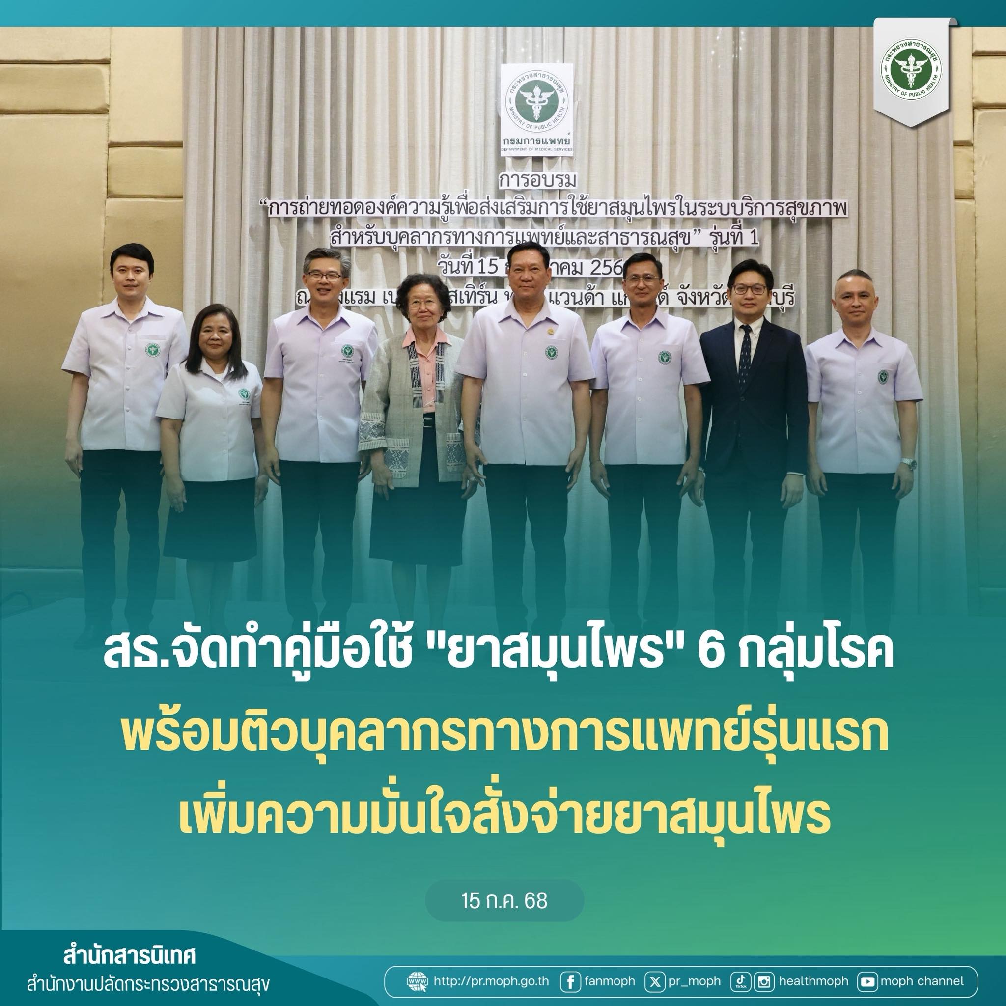 กระทรวงสาธารณสุข จัดทำคู่มือการใช้ยาสมุนไพรในเวชปฏิบัติ ครอบคลุม 6 กลุ่มโรค/อาการ และข้อมูลยาสมุนไพร 17 รายการ พร้อมจัดประชุมอบรมบุคลากรทางการแพทย์รุ่นแรก ช่วยเพิ่มความรู้ความเข้าใจและสร้างความมั่นใจในการสั่งจ่ายยาสมุนไพรแทนยาแผนตะวันตก