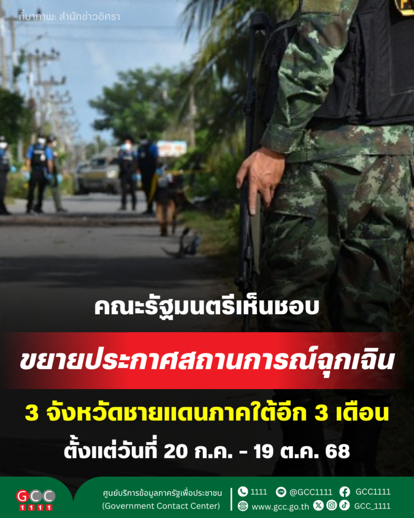 ที่ประชุมคณะรัฐมนตรี เห็นชอบให้ขยายเวลาการประกาศสถานการณ์ฉุกเฉินที่มีความร้ายแรงในพื้นที่จังหวัดชายแดนภาคใต้ ได้แก่ นราธิวาส ปัตตานี และยะลา (เฉพาะบางอำเภอ) ออกไปอีก 3 เดือน ตั้งแต่วันที่ 20 กรกฎาคม – 19 ตุลาคม 2568