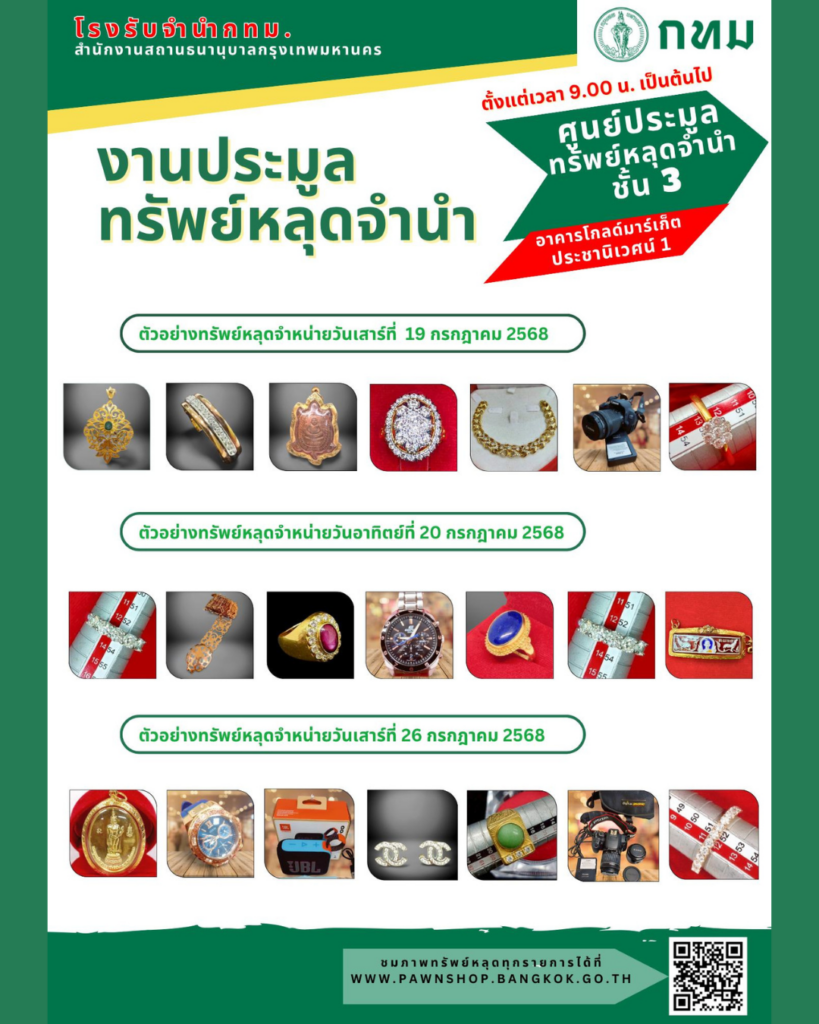 โรงรับจำนำ กทม. เปิดประมูลทรัพย์หลุดจำนำ ในวันที่ 19 , 20 , 26 กรกฎาคม 2568