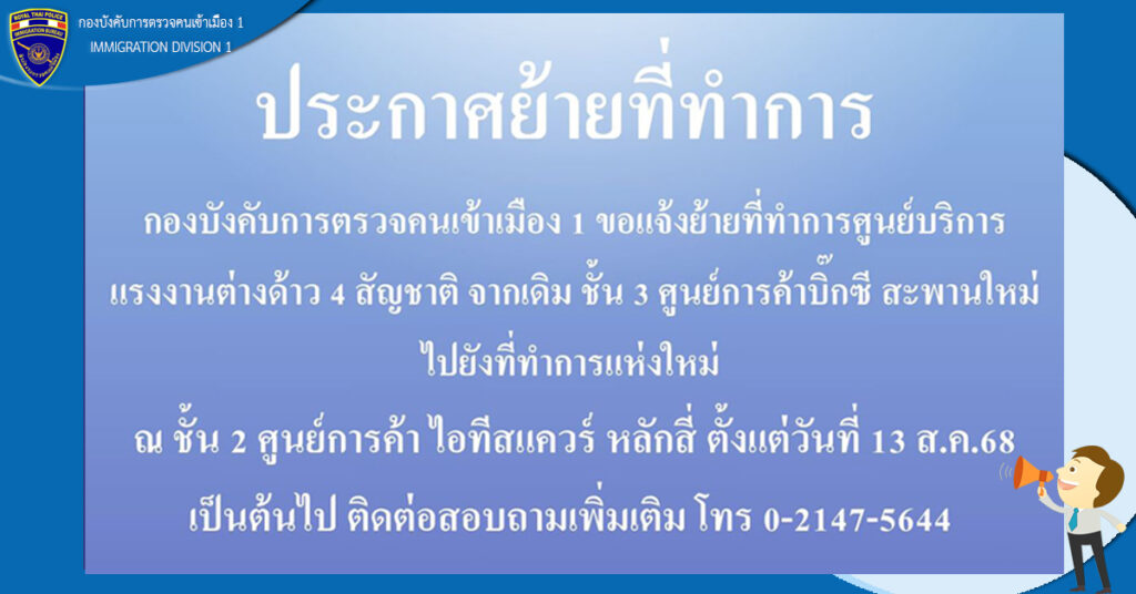 กองบังคับการตรวจคนเข้าเมือง 1 แจ้งย้ายศูนย์บริการแรงงานต่างด้าว 4 สัญชาติ ไปยัง ชั้น 2 ศูนย์การค้าไอทีสแควร์ เขตหลักสี่ กรุงเทพมหานคร เริ่มวันที่ 13 สิงหาคม 2568