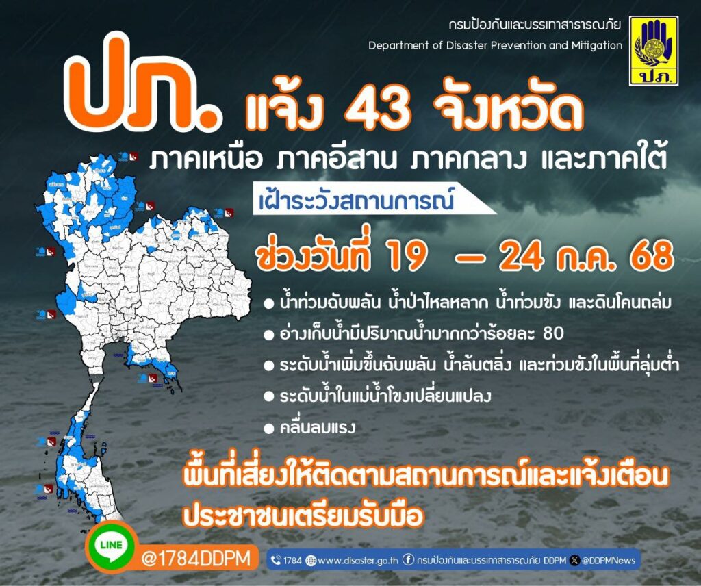 ปภ. แจ้ง 43 จังหวัด ในพื้นที่ภาคเหนือ ภาคตะวันออกเฉียงเหนือ ภาคกลาง และภาคใต้ เฝ้าระวังสถานการณ์น้ำท่วมฉับพลัน น้ำป่าไหลหลาก ดินโคลนถล่ม คลื่นลมแรง ช่วงวันที่ 19 – 24 ก.ค. 68