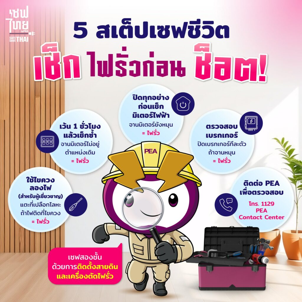 การไฟฟ้าส่วนภูมิภาค แนะนำไฟรั่วไม่ใช่เรื่องไกลตัว รู้วิธีเช็กไว้ ช่วยป้องกันเหตุร้ายได้ก่อน กับ 5 สเต็ปเซฟชีวิต เช็กไฟรั่วก่อนช็อต