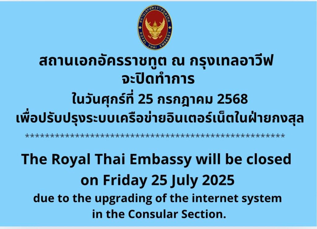 สถานเอกอัครราชทูต ณ กรุงเทลอาวีฟ แจ้งปิดทำการในวันศุกร์ที่ 25 กรกฎาคม 2568 เพื่อปรับปรุงระบบเครือข่ายอินเตอร์เน็ตในฝ่ายกงสุล