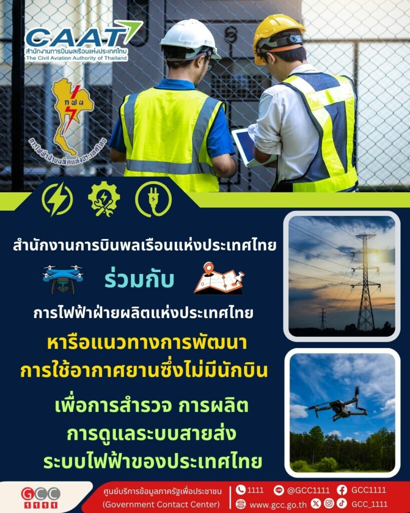 สำนักงานการบินพลเรือนแห่งประเทศไทย ร่วมกับ การไฟฟ้าฝ่ายผลิตแห่งประเทศไทย พัฒนาและการสนับสนุน การนำเทคโนโลยีอากาศยานซึ่งไม่มีนักบินมาใช้ในการสำรวจสายส่ง การทำแผนที่ ใช้ในการสนับสนุนภารกิจ กฟผ. เพิ่มประสิทธิภาพการผลิตไฟฟ้าและการปฏิบัติงานของ กฟผ. ให้ดำเนินได้อย่างต่อเนื่องและยั่งยืน
