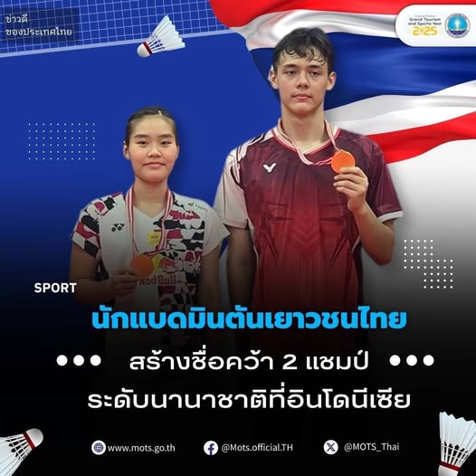 นักแบดมินตันเยาวชนไทย คว้า 2 แชมป์ระดับนานาชาติที่ประเทศอินโดนีเซีย ในการแข่งขัน YONEX SUNRISE Pembangunan Jaya Raya Junior International Grand Prix 2025 โดย “ลูคัส เอกรัฐ เวดเลอร์” และ “ชัญญพัชร์ ชาติวีระชัยศรี” คว้าแชมป์ประเภทคู่ผสม รุ่นอายุไม่เกิน 19 ปี (U19) ขณะที่ “น้ำหวาน” ต้นรัก แซ่เฮ้ง คว้าแชมป์ประเภทหญิงเดี่ยว รุ่นอายุไม่เกิน 19 ปี (U19) สะท้อนถึงศักยภาพของระบบพัฒนาเยาวชนกีฬาไทย และยืนยันความพร้อมของประเทศไทยในการเป็นผู้นำด้านกีฬาในภูมิภาคอาเซียน