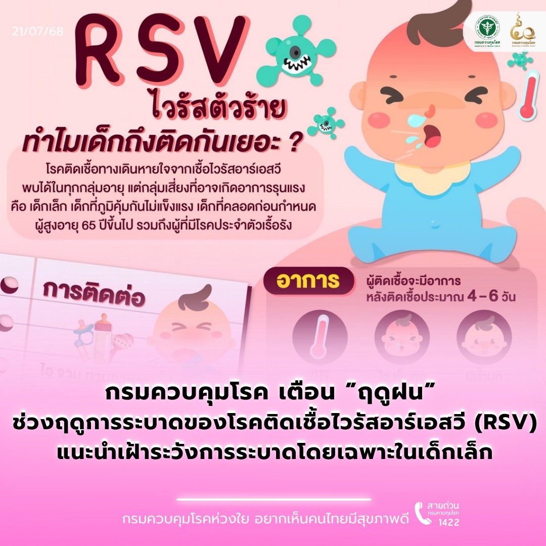 กรมควบคุมโรค เตือนผู้ปกครองที่มีบุตรหลานเด็กเล็ก และผู้สูงอายุ เฝ้าระวังโรคติดเชื้อไวรัสอาร์เอสวี (Respiratory Syncytial Virus: RSV) ซึ่งมักพบการระบาดสูงช่วงเดือนกรกฎาคมถึงพฤศจิกายนของทุกปี โดยเฉพาะในเด็กอายุต่ำกว่า 2 ปี ที่เสี่ยงป่วยรุนแรง
