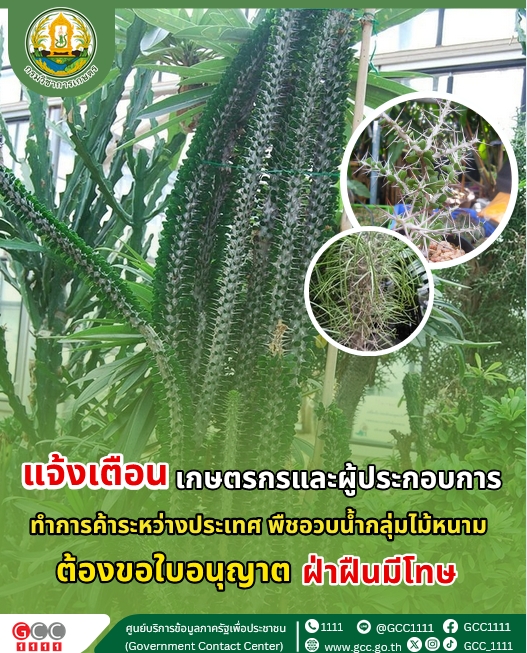 นายภัสชญภณ หมื่นแจ้ง รองอธิบดีกรมวิชาการเกษตร ในฐานะโฆษกกรมวิชาการเกษตร เปิดเผยว่า กรมวิชาการเกษตรขอแจ้งเตือนเกษตรกรและผู้ประกอบการที่เพาะเลี้ยงหรือค้าพืชอวบน้ำในกลุ่มไม้หนาม ได้แก่ พืชในวงศ์ไดดิเรียซีอี (Didiereaceae) และวงศ์เฟาเควอเรียซีอี (Fouquieriaceae) ซึ่งเป็น“พืชอนุรักษ์” ภายใต้บัญชีแนบท้ายของอนุสัญญาว่าด้วยการค้าระหว่างประเทศซึ่งชนิดสัตว์ป่าและพืชป่าที่ใกล้สูญพันธุ์ หรือ ไซเตส (CITES) หากทำการค้าระหว่างประเทศ ต้องยื่นขอใบอนุญาต CITES Permit และขึ้นทะเบียนสถานที่เพาะเลี้ยงพืชอนุรักษ์ กับกรมวิชาการเกษตร เนื่องจากพืชกลุ่มนี้กำลังถูกคุกคามอย่างรุนแรงจากการลักลอบเก็บหาจากธรรมชาติเพื่อการค้า รวมถึงการบุกรุกพื้นที่ป่าจากกิจกรรมทางการเกษตรทำให้หลายชนิดอยู่ในภาวะใกล้สูญพันธุ์และต้องได้รับการคุ้มครองภายใต้กฎหมายทั้งในระดับประเทศและระหว่างประเทศ