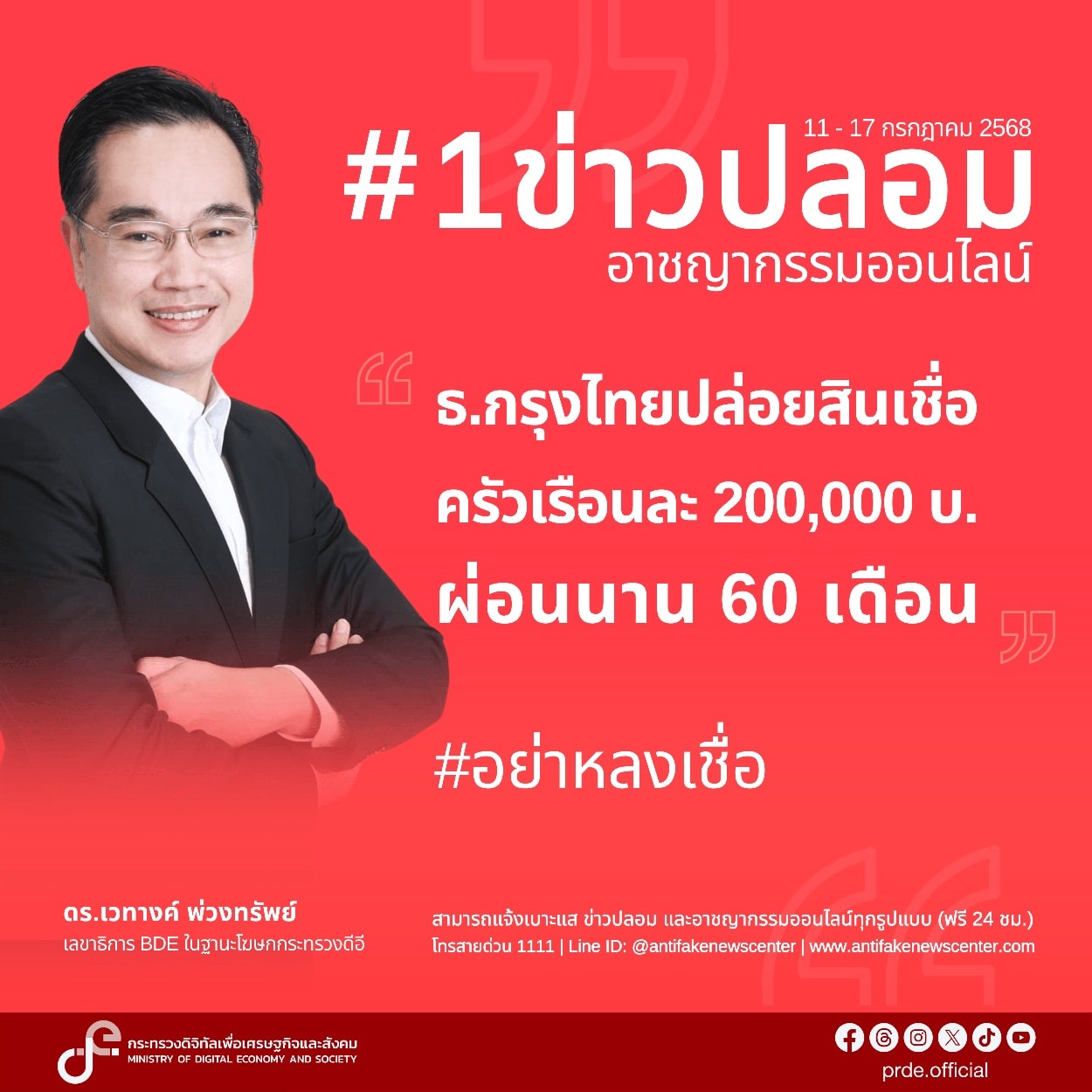 สำหรับอันดับ 1 เรื่อง “ธนาคารกรุงไทยปล่อยสินเชื่อ ครัวเรือนละ 200,000 บาท ผ่อนนาน 60 เดือน” กระทรวงดีอี ได้ประสานงาน ธนาคารกรุงไทย กระทรวงการคลัง ตรวจสอบพบว่า เป็นข้อมูลเท็จ โดยขอชี้แจงว่า ธนาคารกรุงไทยไม่มีบริการปล่อยสินเชื่อ ครัวเรือนละ 200,000 บาท ผ่อนนาน 60 เดือน ผ่านบัญชี TikTok ชื่อ bbbbi989 โดยบัญชีดังกล่าวเป็นมิจฉาชีพแฝงตัวมาหลอกลวง ซึ่งได้มีการนำภาพของธนาคารกรุงไทยไปแอบอ้าง ทั้งนี้ ธนาคารไม่มีนโยบายปล่อยสินเชื่อผ่านบัญชี TikTok ใด ๆ ทั้งสิ้น โดยหากต้องการสอบถามข้อมูลเพิ่มเติมสามารถติดต่อได้ที่ 0 2111 1111 ตลอด 24 ชั่วโมง หรือที่เพจเฟซบุ๊ก Krungthai Care (https://www.facebook.com/krungthaibank) ดังนั้นขอเตือนประชาชนให้ระมัดระวังการสมัครขอรับสินเชื่อผ่านทางออนไลน์ ซึ่งเท่ากับเป็นการให้ข้อมูลส่วนบุคคลแก่มิจฉาชีพ