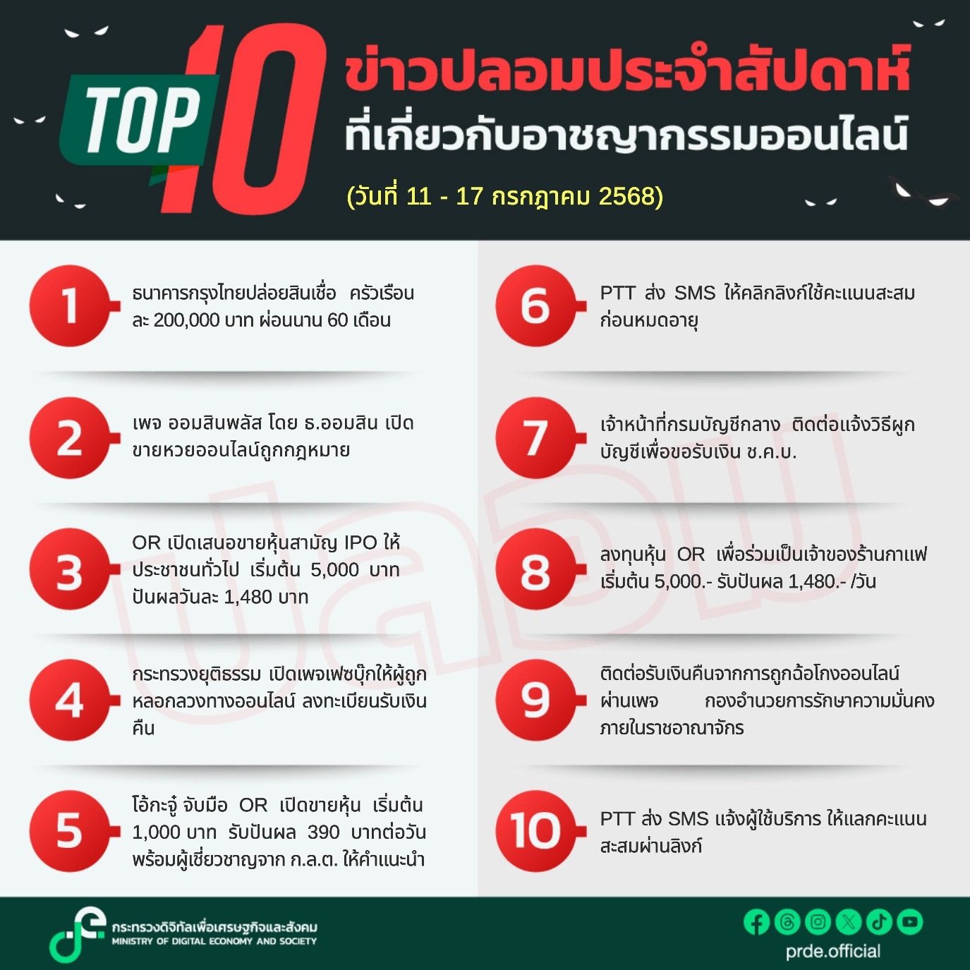 กระทรวงดิจิทัลเพื่อเศรษฐกิจและสังคม ตรวจพบข่าวปลอมรายสัปดาห์ที่เกี่ยวข้องกับอาชญากรรมออนไลน์ ซึ่งประชาชนให้ความสนใจสูงสุดอันดับที่ 1 เรื่อง “ธนาคารกรุงไทยปล่อยสินเชื่อ ครัวเรือนละ 200,000 บาท ผ่อนนาน 60 เดือน” รองลงมาคือเรื่อง “เพจ ออมสินพลัส โดย ธ.ออมสิน เปิดขายหวยออนไลน์ถูกกฎหมาย” โดยขอให้ประชาชน อย่าหลงเชื่อข่าวปลอม เลือกเชื่อ-แชร์ ข้อมูลที่เป็นประโยชน์ หวั่นสร้างความสูญเสียทั้งข้อมูลส่วนบุคคล ทรัพย์สิน และอาจส่งผลกระทบต่อประชาชนในสังคมเป็นวงกว้าง