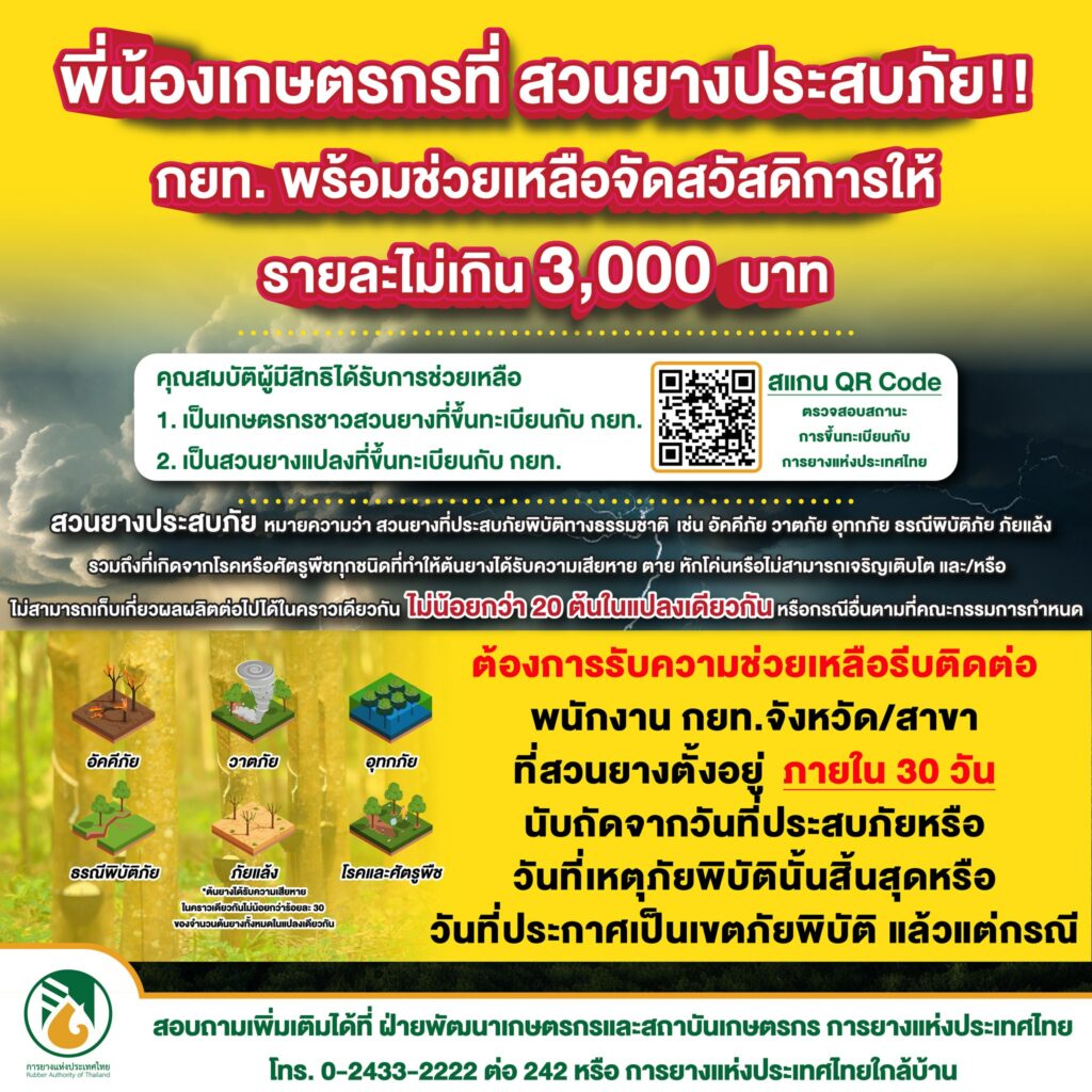 การยางแห่งประเทศไทย เตรียมให้ความช่วยเหลือเกษตรกรชาวสวนยางที่ขึ้นทะเบียนและประสบภัยพิบัติทางธรรมชาติหรือศัตรูพืช โดยมอบเงินรายละไม่เกิน 3,000 บาท