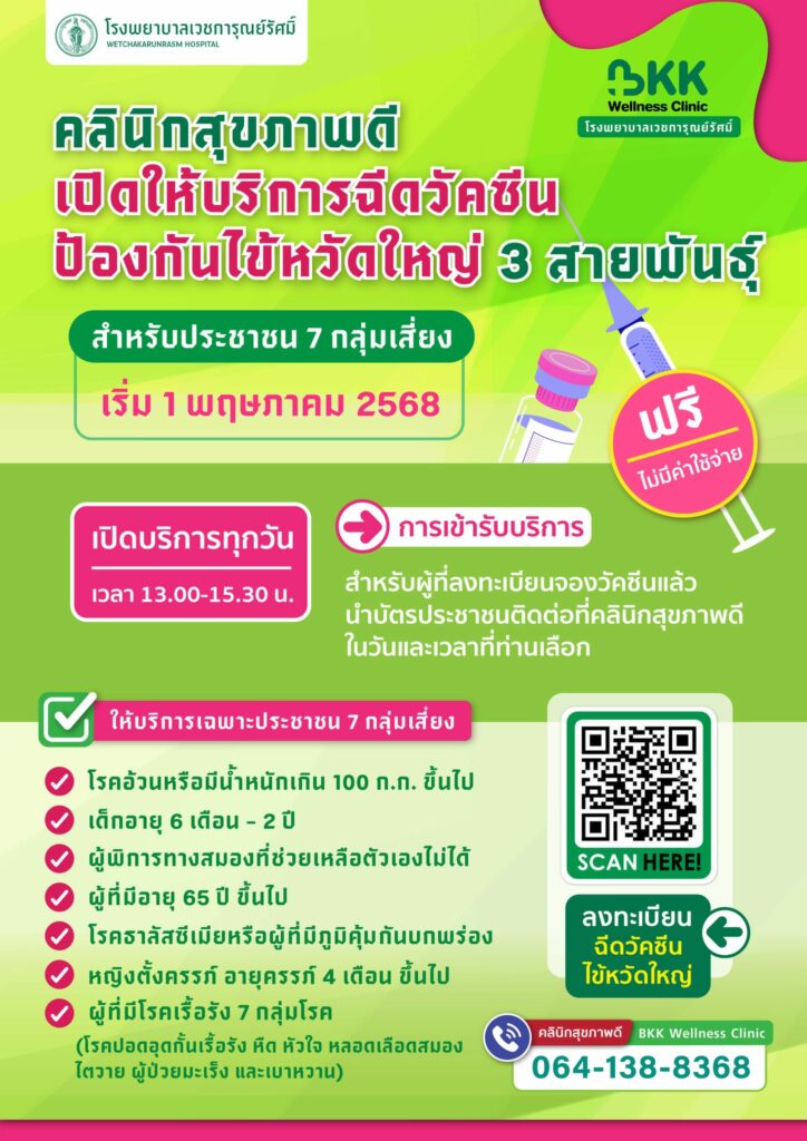 โรงพยาบาลเวชการุณย์รัศมิ์ คลินิกสุขภาพดี (BKK Wellness Clinic) เปิดให้บริการฉีดวัคซีนป้องกันไข้หวัดใหญ่ 3 สายพันธุ์ ฟรี เฉพาะประชาชน 7 กลุ่มเสี่ยง