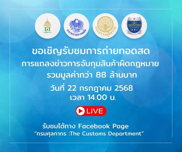 กรมศุลกากร จัดการแถลงข่าวการจับกุมสินค้าผิดกฎหมาย รวมมูลค่ากว่า 88 ล้านบาท วันที่ 22 กรกฎาคม 2568 เวลา 14.00 น. สามารถ LIVE รับชมได้ทาง Facebook Page “กรมศุลกากร : The Customs Department”