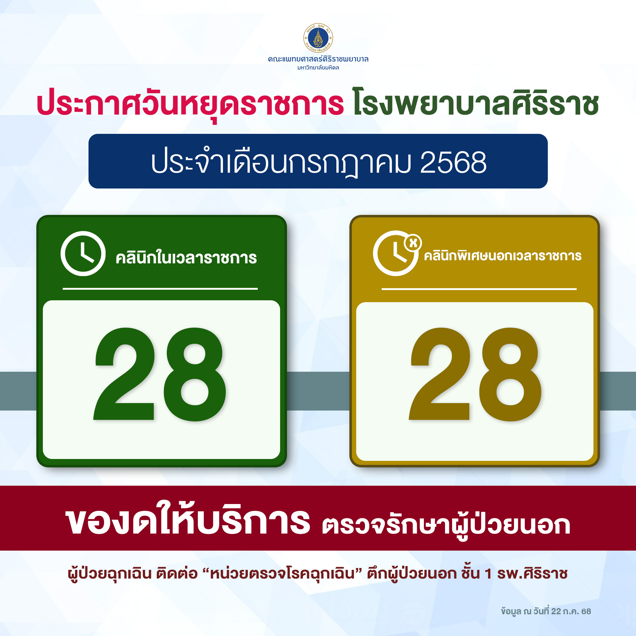 โรงพยาบาลศิริราช ประกาศวันหยุดราชการ วันที่ 28 กรกฎาคม 2568 โดยคลินิกในเวลาราชการ เเละ คลินิกพิเศษนอกเวลาราชการ งดให้บริการตรวจรักษาผู้ป่วยนอก ผู้ป่วยฉุกเฉิน โปรดติดต่อ หน่วยตรวจโรคฉุกเฉิน ตึกผู้ป่วยนอก ชั้น 1 รพ.ศิริราช