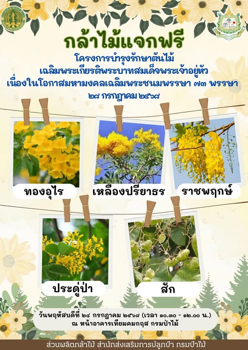 - กรมป่าไม้ แจกกล้าไม้ในงานโครงการบำรุงรักษาต้นไม้เฉลิมพระเกียรติพระบาทสมเด็จพระเจ้าอยู่หัว เนื่องในโอกาสมหามงคลเฉลิมพระชนมพรรษา 73 พรรษา 28 กรกฎาคม 2568 ณ ลานหน้าอาคารเทียมคมกฤส กรมป่าไม้ ในวันที่ 24 กรกฎาคม 2568 เวลา 10.30 – 12.00 น. จำนวน 500 ต้น จำกัดท่านละ 4 ต้น