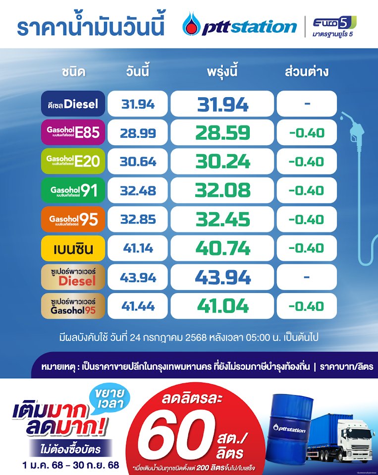 ปตท. ปรับลดราคาน้ำมันกลุ่มเบนซิน ส่วนน้ำมันในกลุ่มดีเซลราคาคงเดิม มีผลวันที่ 24 ก.ค. 68