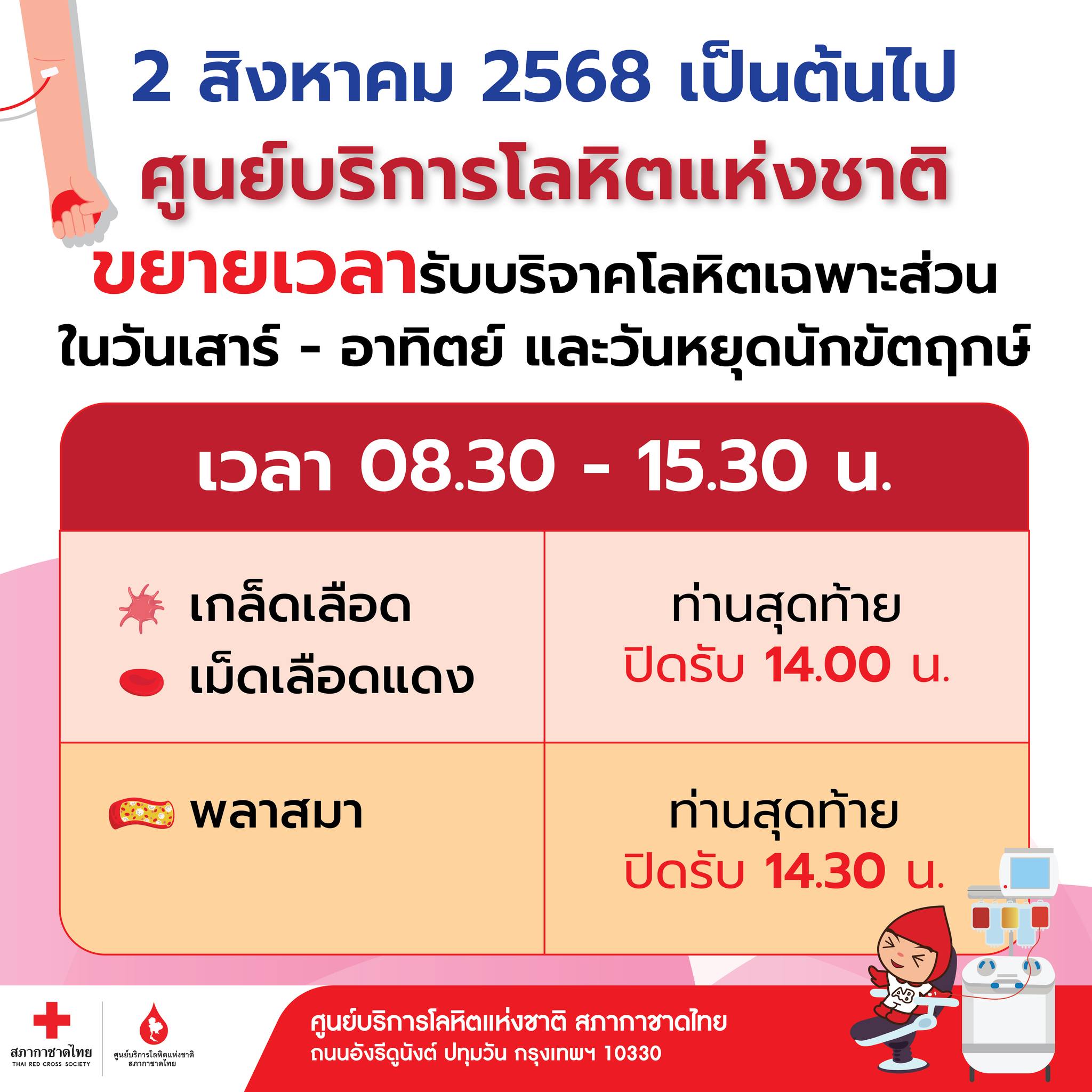 ศูนย์บริการโลหิตแห่งชาติ ขยายเวลาห้องรับบริจาคโลหิตเฉพาะส่วน Apheresis ในวันเสาร์ อาทิตย์ และวันหยุดนักขัตฤกษ์ ตั้งแต่วันที่ 2 สิงหาคม 2568 เป็นต้นไป ณ ศูนย์บริการโลหิตแห่งชาติ สภากาชาดไทย