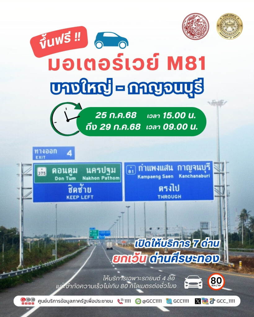 กรมทางหลวง เปิดทดลองให้บริการทางหลวงพิเศษระหว่างเมืองหมายเลข 81 สายบางใหญ่ – กาญจนบุรี (มอเตอร์เวย์ M81) ระยะทาง 96 กิโลเมตรบางส่วน โดยไม่เก็บค่าธรรมเนียมผ่านทาง ตั้งแต่วันศุกร์ที่ 25 กรกฎาคม 2568 เวลา 15.00 น. ไปจนถึง วันอังคารที่ 29 กรกฎาคม 2568 เวลา 09.00 น. เพื่ออำนวยความสะดวกในการเดินทางของประชาชนในช่วงวันหยุดยาว เนื่องในโอกาสวันเฉลิมพระชนมพรรษา พระบาทสมเด็จพระเจ้าอยู่หัว ซึ่งคาดว่าจะมีประชาชนใช้เส้นทางในการเดินทางจำนวนมาก