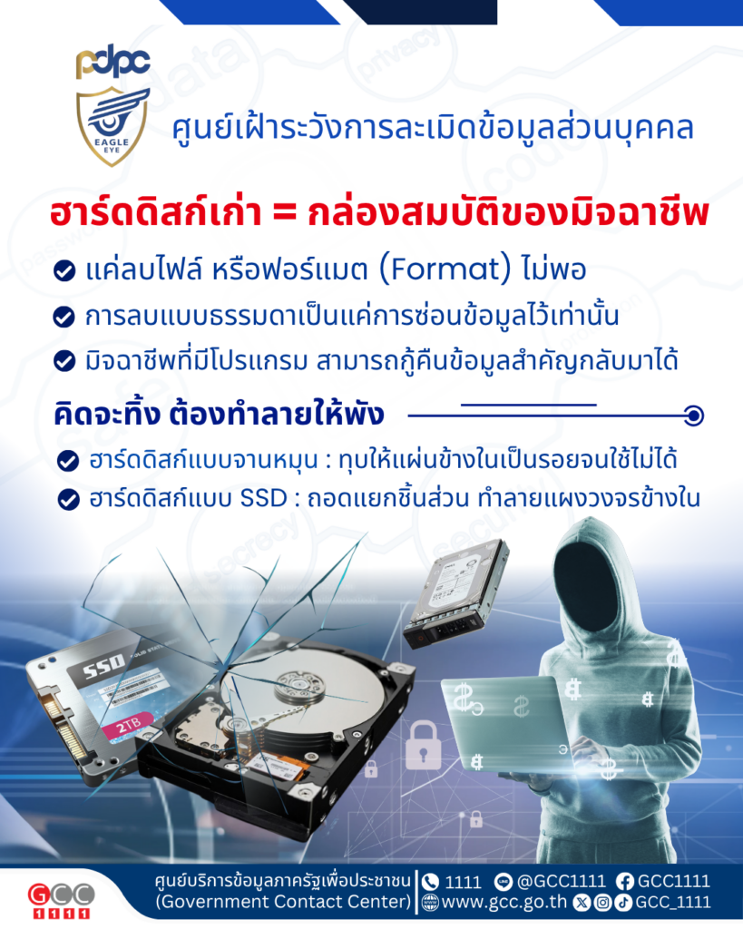 ศูนย์เฝ้าระวังการละเมิดข้อมูลส่วนบุคคล เตือน ฮาร์ดดิสก์เก่า เท่ากับ กล่องสมบัติของมิจฉาชีพ ข่าวสารกิจกรรม ศูนย์เฝ้าระวังการละเมิดข้อมูลส่วนบุคคล เตือน ฮาร์ดดิสก์เก่า เท่ากับ กล่องสมบัติของมิจฉาชีพ คอมพิวเตอร์เก่าๆ หรือฮาร์ดดิสก์ (ตัวเก็บข้อมูล) ที่เราไม่ใช้แล้ว มันจะยังมีข้อมูลสำคัญของเราเหลืออยู่ไหม ? คำตอบคือ มีแน่นอน ถึงแม้เราจะลบไฟล์ไปแล้ว ข้อมูลเหล่านั้นก็ยังสามารถกู้กลับมาได้ ทำไมการทิ้งฮาร์ดดิสก์เก่าแบบไม่ถูกวิธีถึงอันตรายแค่ลบไฟล์ หรือฟอร์แมต (Format) ไม่พอ : การลบแบบธรรมดาเป็นแค่การซ่อนข้อมูลไว้เท่านั้น มิจฉาชีพที่มีโปรแกรมสามารถกู้คืนข้อมูลสำคัญของเรากลับมาได้ ทั้งรูปภาพ เอกสารส่วนตัว หรืออาจมีข้อมูลทางการเงินหลงเหลืออยู่คิดจะทิ้ง ต้องทำลายให้พังฮาร์ดดิสก์แบบจานหมุน : เอาไปทุบให้แผ่นข้างในเป็นรอยจนใช้ไม่ได้ หรือใช้เครื่องทำลายแบบพิเศษก็ได้ฮาร์ดดิสก์แบบ SSD : ต้องถอดแยกชิ้นส่วน แล้วทำลายแผงวงจรข้างในให้พังจนไม่สามารถประกอบกลับมาได้อีก ง่ายๆ คือ ถ้าฮาร์ดดิสก์เก่าอันไหนมีข้อมูลสำคัญของเราอยู่ และคุณจะไม่ใช้แล้วจริงๆ “ทำลายทิ้งไปเลย” อย่าปล่อยให้ “ของเก่า” กลายเป็น “ภัยใหม่” เพราะภัยไซเบอร์อาจเริ่มจากเรื่องใกล้ตัว ที่มา : Facebook ศูนย์เฝ้าระวังการละเมิดข้อมูลส่วนบุคคล – PDPC Eagle Eye Post Views: 30 FacebookFacebookXTwitterLINELine