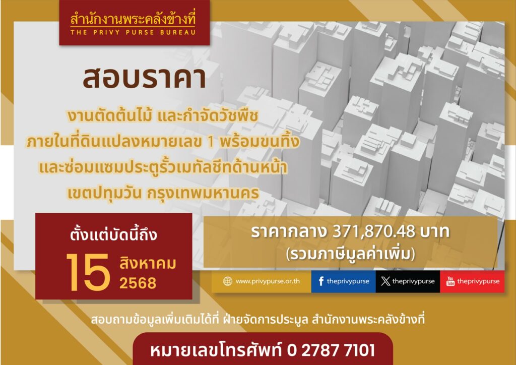 สำนักงานพระคลังข้างที่ เปิดสอบราคางานตัดต้นไม้ และกำจัดวัชพืช ภายในที่ดินแปลงหมายเลข 1 พร้อมขนทิ้ง และซ่อมแซมประตูรั้วเมทัลชีทด้านหน้า เขตปทุมวัน กรุงเทพมหานครตั้งแต่บัดนี้ – 15 สิงหาคม 2568