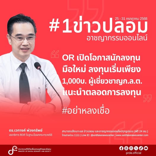 กระทรวงดิจิทัลเพื่อเศรษฐกิจและสังคม (ดีอี) ตรวจพบข่าวปลอมรายสัปดาห์ที่เกี่ยวข้องกับอาชญากรรมออนไลน์ ซึ่งประชาชนให้ความสนใจสูงสุดอันดับที่ 1 เรื่อง “OR เปิดโอกาสให้นักลงทุนมือใหม่เข้าร่วมลงทุน เริ่มต้นเพียง 1,000 บาท พร้อมผู้เชี่ยวชาญชั้นนำจาก ก.ล.ต. ให้คำแนะนำตลอดการลงทุน” รองลงมาคือเรื่อง “เพจเฟซบุ๊ก ชื่อ บริษัทจัดหางาน วี ดรากอน จำกัด รับรองโดยกรมแรงงาน เปิดรับสมัครงานฟาร์มออสเตรเลีย” โดยขอให้ประชาชน อย่าหลงเชื่อข่าวปลอม เลือกเชื่อ-แชร์ ข้อมูลที่เป็นประโยชน์ หวั่นสร้างความเสียหายทั้งข้อมูลส่วนบุคคล ทรัพย์สิน และอาจส่งผลกระทบต่อประชาชนในสังคมเป็นวงกว้าง