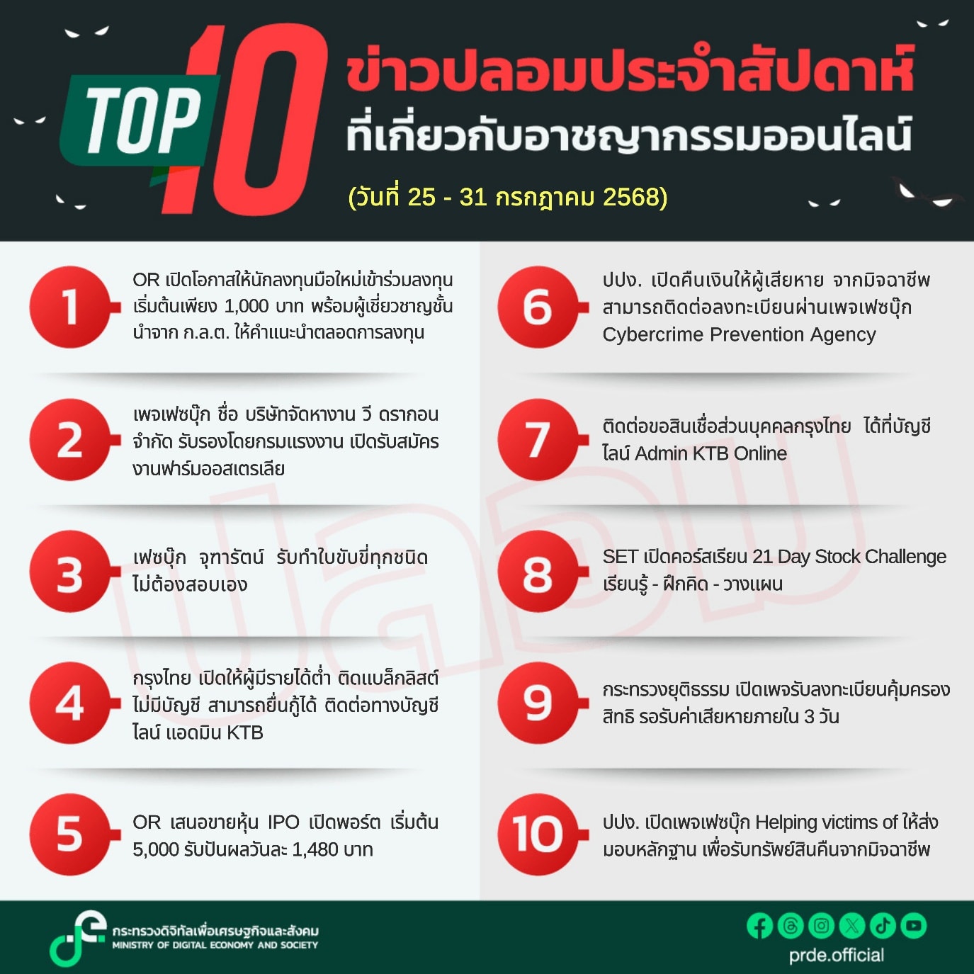 กระทรวงดิจิทัลเพื่อเศรษฐกิจและสังคม ตรวจพบข่าวปลอมรายสัปดาห์ที่เกี่ยวข้องกับอาชญากรรมออนไลน์ อันดับที่ 1 เรื่อง “OR เปิดโอกาสให้นักลงทุนมือใหม่เข้าร่วมลงทุน เริ่มต้นเพียง 1,000 บาท พร้อมผู้เชี่ยวชาญชั้นนำจาก ก.ล.ต. ให้คำแนะนำตลอดการลงทุน” รองลงมาคือเรื่อง “เพจเฟซบุ๊ก ชื่อ บริษัทจัดหางาน วี ดรากอน จำกัด รับรองโดยกรมแรงงาน เปิดรับสมัครงานฟาร์มออสเตรเลีย” โดยขอให้ประชาชน อย่าหลงเชื่อข่าวปลอม เลือกเชื่อ-แชร์ ข้อมูลที่เป็นประโยชน์ หวั่นสร้างความเสียหายทั้งข้อมูลส่วนบุคคล ทรัพย์สิน และอาจส่งผลกระทบต่อประชาชนในสังคมเป็นวงกว้าง