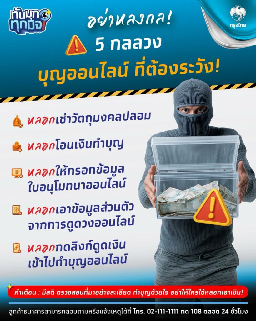 ธนาคารกรุงไทย เตือนภัย อย่าหหลงเชื่อ 5 กลลวง บุญออนไลน์ ที่ต้องระวัง