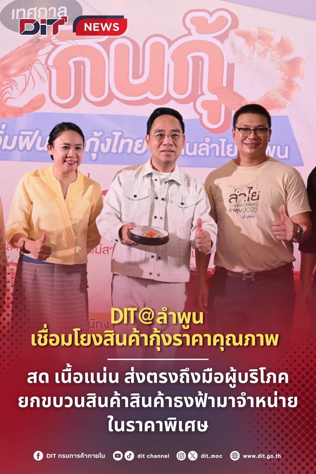 DIT กรมการค้าภายในร่วมกับสำนักงานพาณิชย์จังหวัดลำพูน เดินหน้าจัด “กิจกรรมรณรงค์การบริโภคกุ้งภายในประเทศ จังหวัดลำพูน” ภายใต้โครงการพัฒนาและส่งเสริมศักยภาพการแข่งขันสินค้าประมงปี 2568 เพื่อสนับสนุนเกษตรกรผู้เลี้ยงกุ้งให้มีช่องทางจำหน่ายที่มากขึ้น และสร้างการรับรู้ให้ผู้บริโภคเข้าถึงกุ้งคุณภาพในราคาที่เป็นธรรม